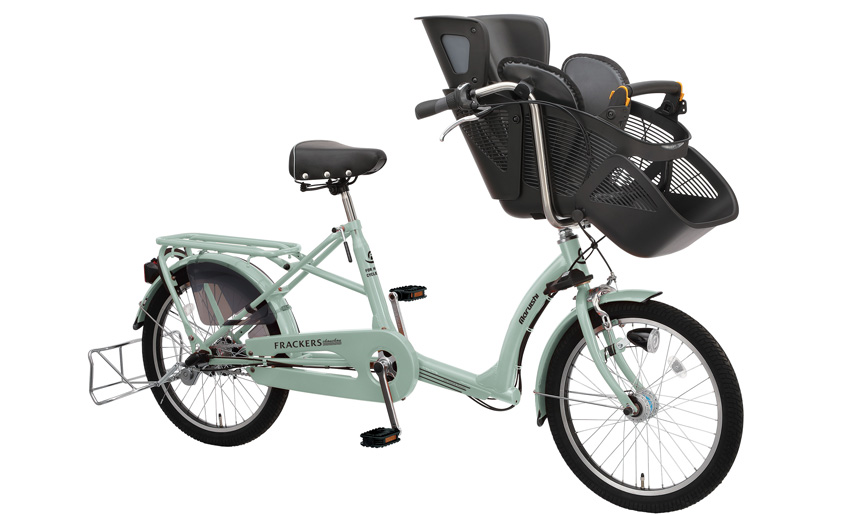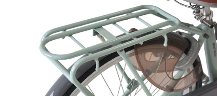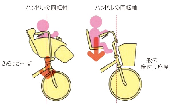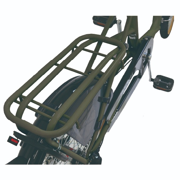 広くて長い大きなパイプキャリアはフレーム形状にあわせて設計。リヤチャイルドシートを取り付けてもしっかり支えられ、小径モデルで発生してしまう重心不安定のための前輪持ち上がりも防止します。