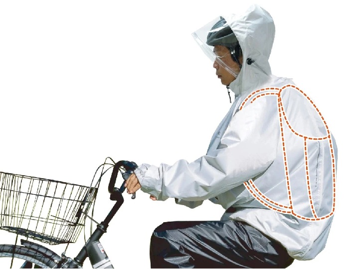 リュックを背負ったまま、ヘルメットを被ったままでも着用できる設計で、自転車通勤・通学に最適なレインウェアです。