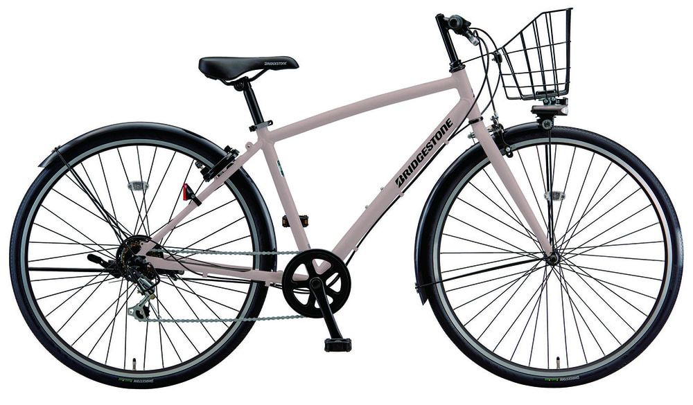 通勤通学に必要なパーツであるドロヨケ、カギ、フロントバスケット、オートロックスタンド、更にLEDバッテリーライトまで装備されているコスパにも優れたお手ごろクロスバイク。