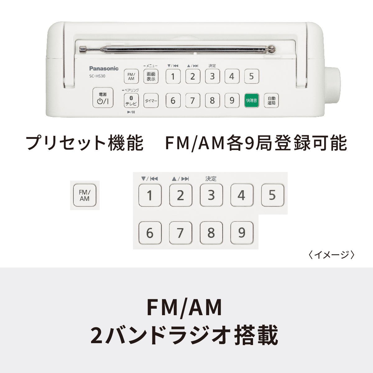 AM:522~1629kHz(9kHzステップ)モノラル |