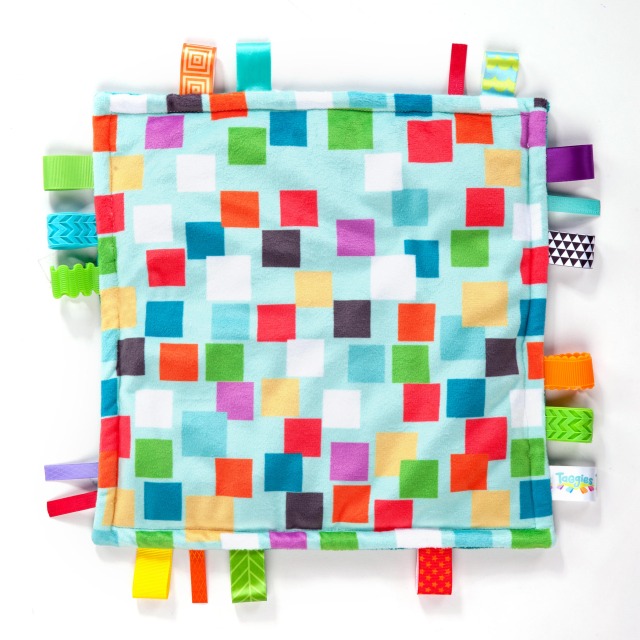 サテン地のタグが付いたカラフルな布製おもちゃです。