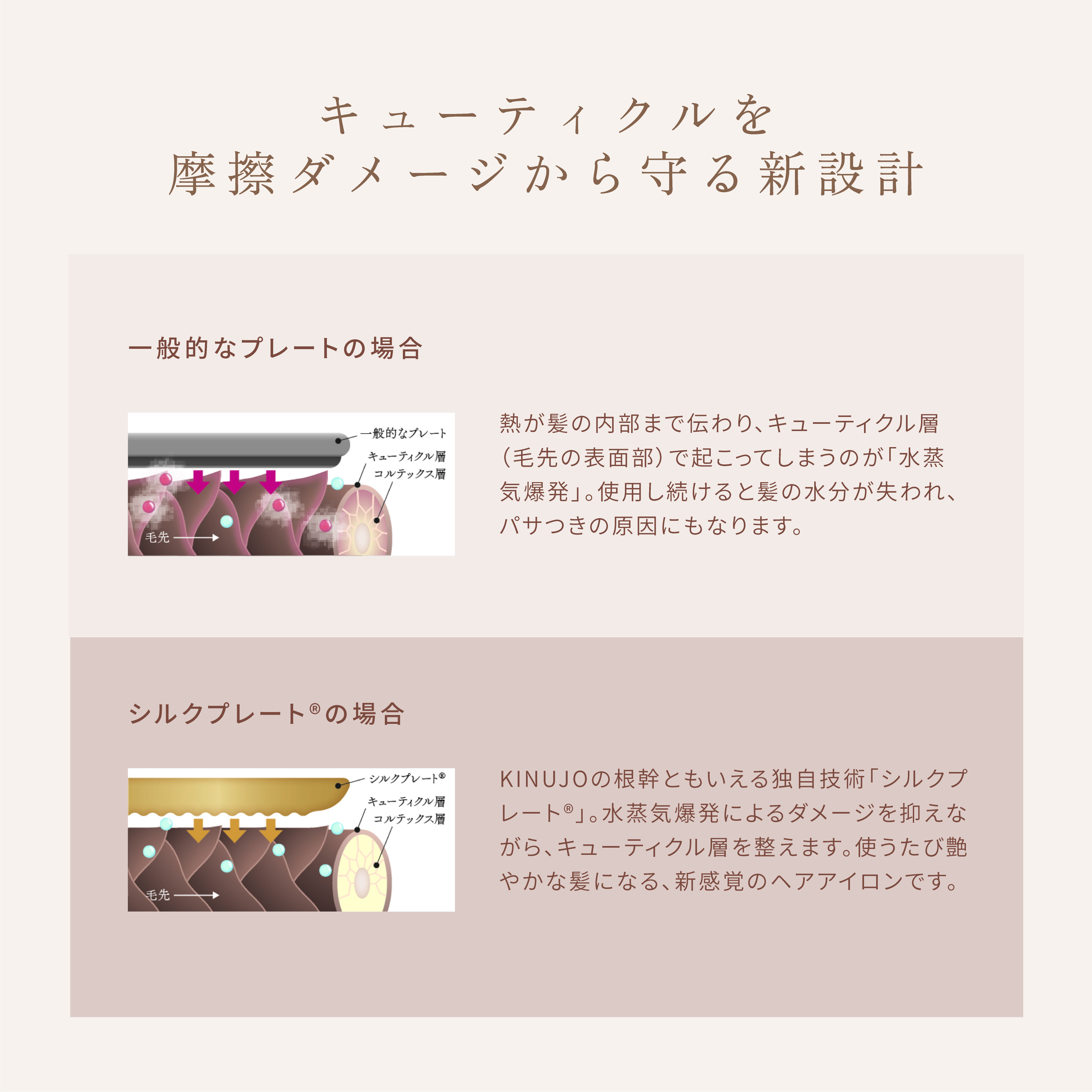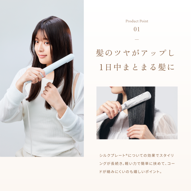 摩擦を抑えた髪に優しい「シルクプレート」は、キューティクルを傷めず、引っ掛かりのないストレスフリーなスタイリングを可能にしました。
