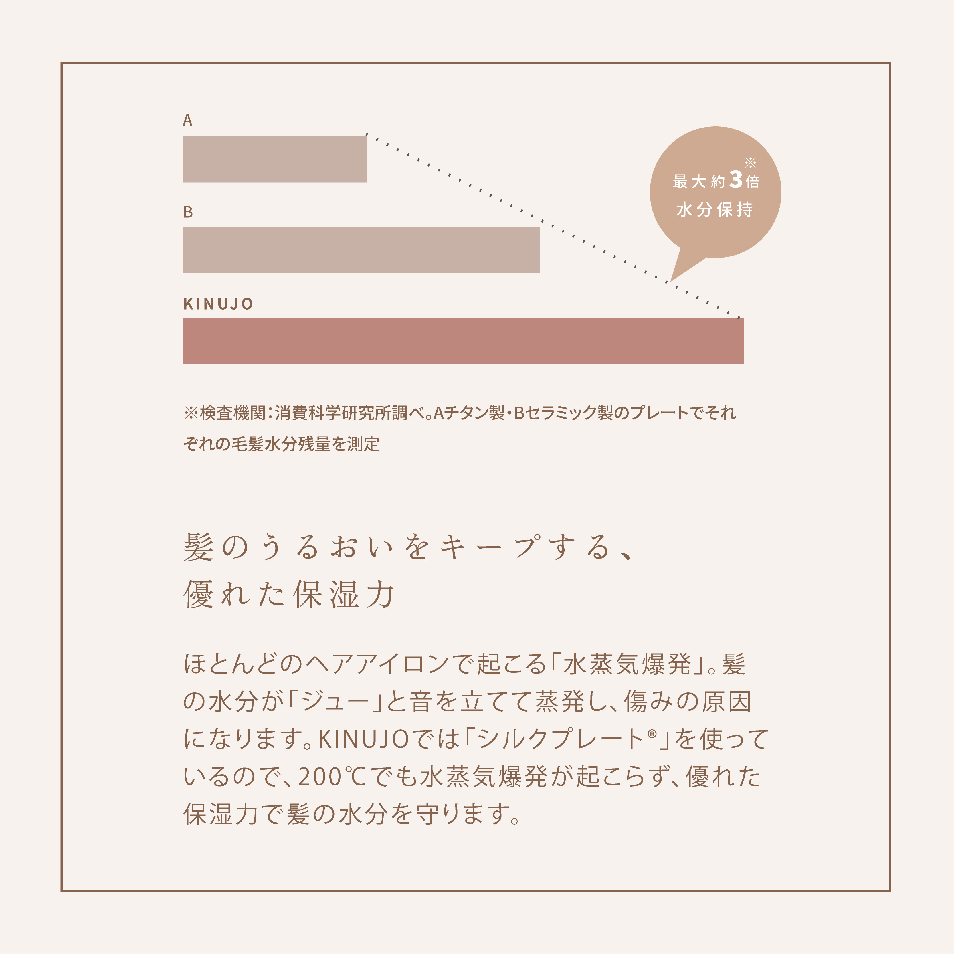 「シルクプレート」は他の主流なプレートに比べ、ヘアアイロン使用後の髪内部の水分保湿力が約3倍もあります。
