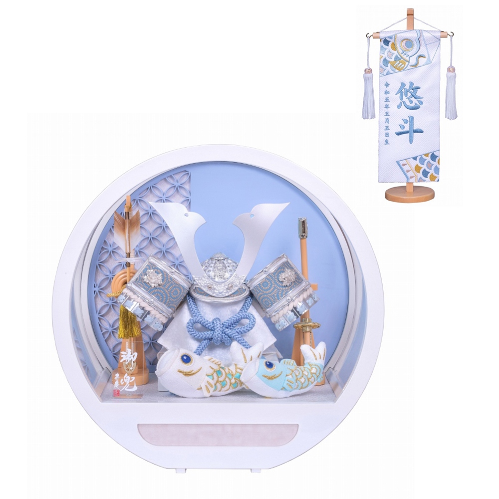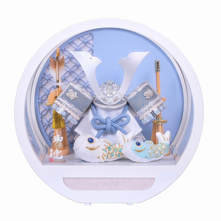 シルバー色の鍬形兜に円満・調和の願いを込めた七宝柄背景の円型ケース飾りです。