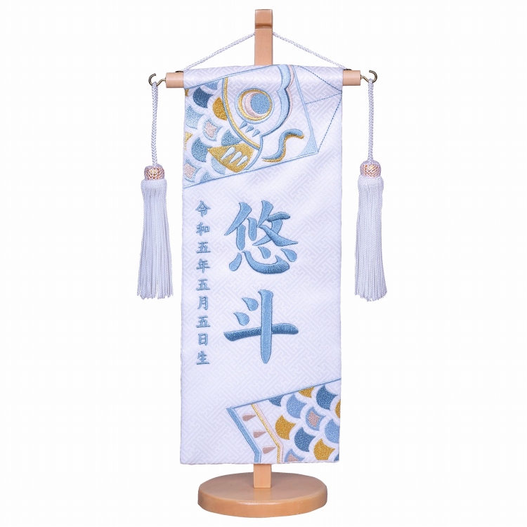 ジャガード織りの生地を使用した鯉のぼり柄の名前旗です。