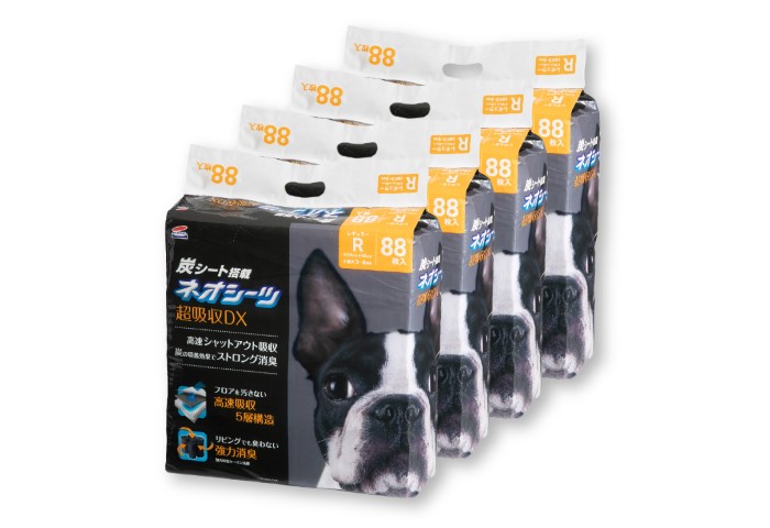 ●長時間使用可能な超厚型タイプのペットシーツ。レギュラーサイズ・88枚入り。国産。炭シート搭載で消臭効果も抜群。小型犬3~4回まで対応。