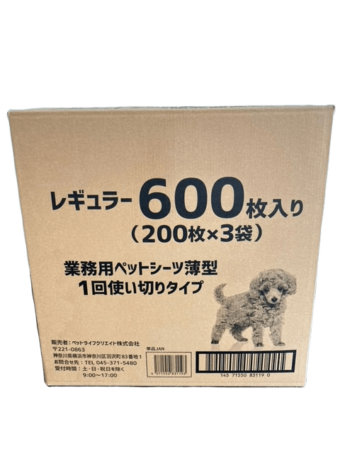 業務用ペットシーツ薄型のレギュラーサイズです。1回使い切りタイプです。600枚と大容量タイプの枚数なので、多頭飼いの飼い主様やストック買いにもおすすめです。