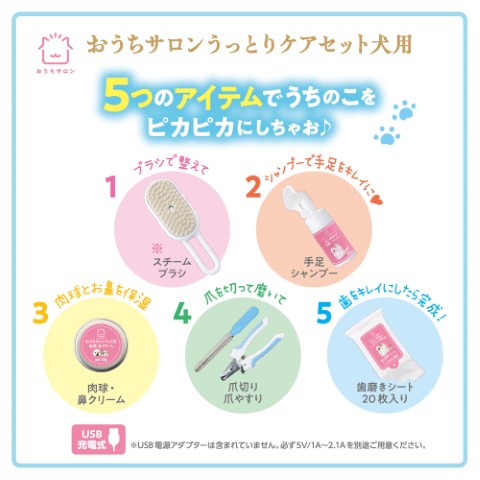 【セット内容】スチームブラシ(USB充電式:電源アダプター別途用意)、手足シャンプー、肉球・鼻クリーム、爪切り・爪やすり、歯磨きシート