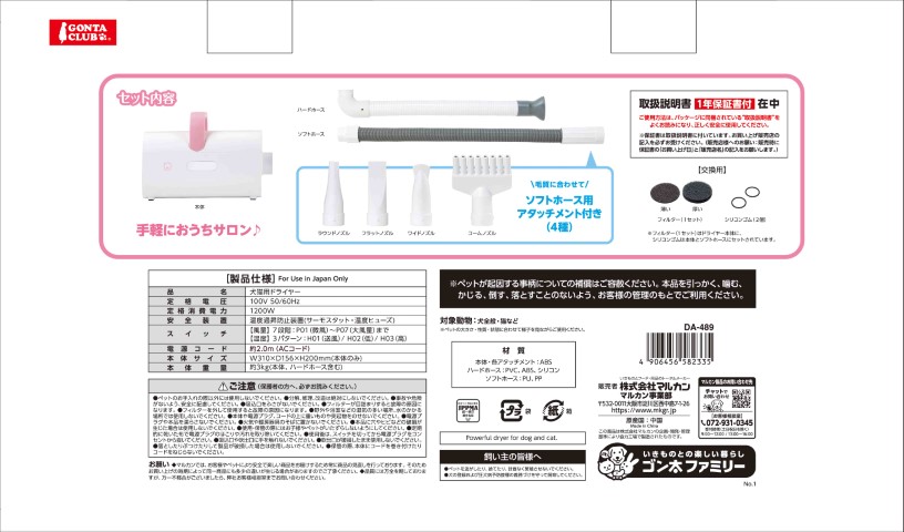 【仕様】風量7段階×温度3パターン、マイナスイオン搭載、小回りが利くソフトホース、自由自在に曲げて固定ハードホース、選べる4種のノズル付き(ラウンド/フラット/ワイド/コーム)、1年保証