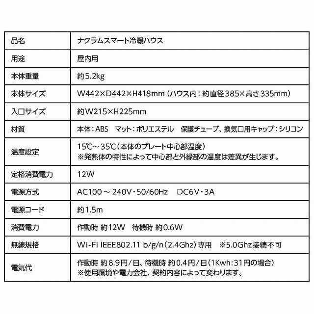 DC6V・3A、アプリで管理(温度/湿度/滞在時間)、オートモード/エコモード設定、温度設定(15~35℃:無段階調節設定)、1年保証