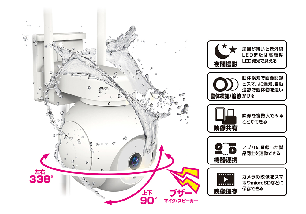 左右338°上下90°スマートフォン操作でカメラを自由に動かせるので見たいところに調節可能。
