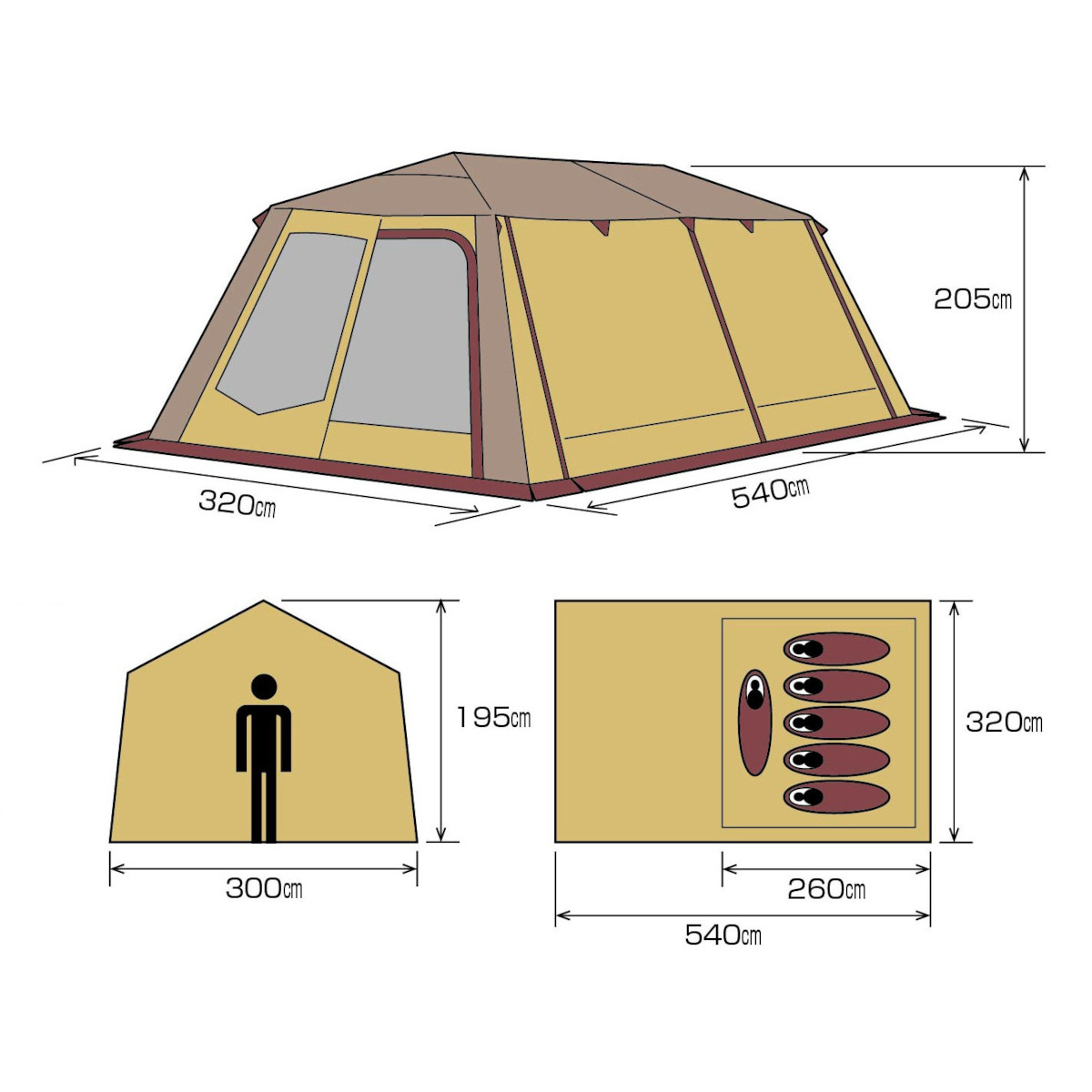 フライ:320×540×H205cm、インナーテント:300×260×H195cm