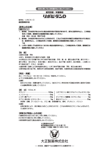 タウリン:1000mg、イノシトール:50mg、ニコチン酸アミド:20mg、チアミン硝化物 (ビタミンB1):5mg、リボフラビンリン酸エステルナトリウム (ビタミンB2):5mg、ピリドキシン塩酸塩 (ビタミンB6):5mg、無水カフェイン:50mg