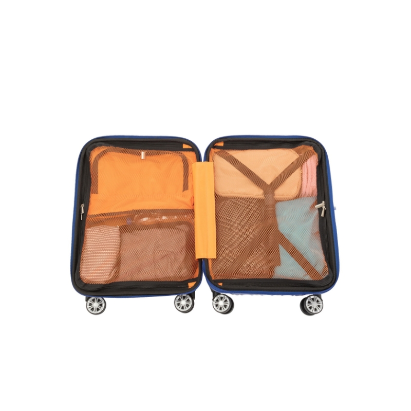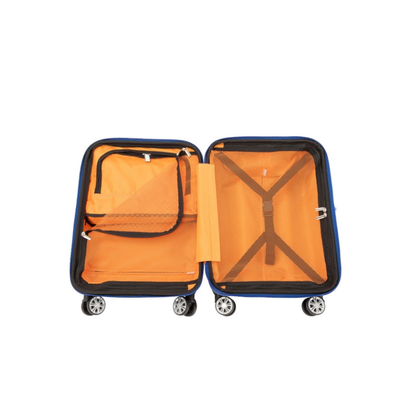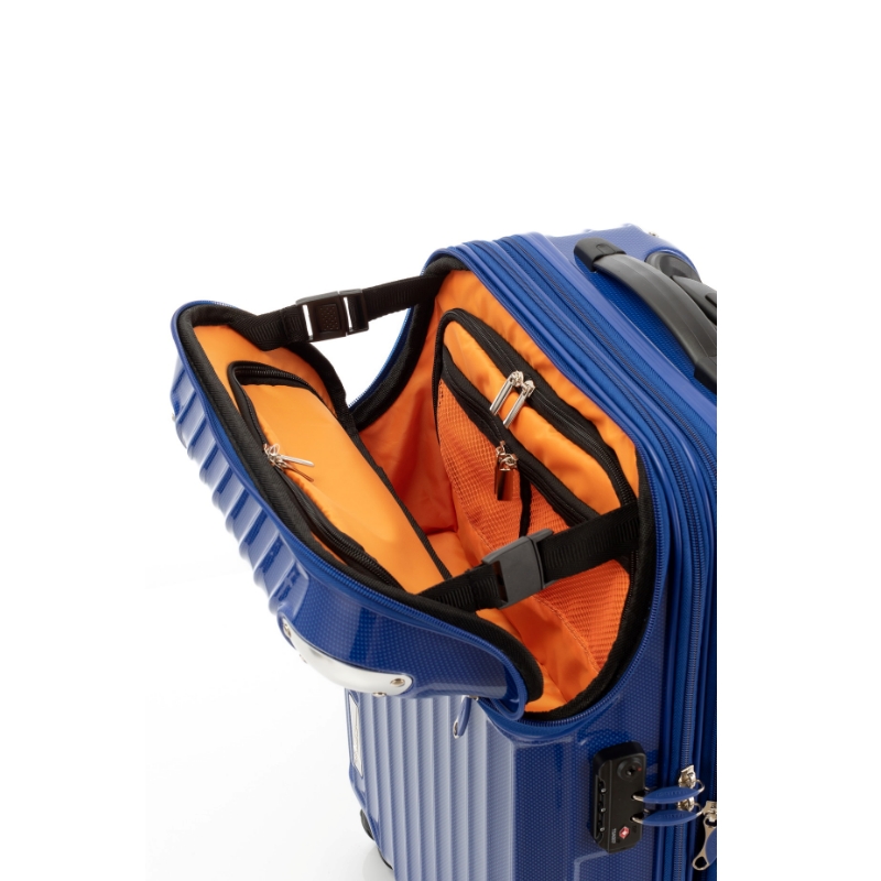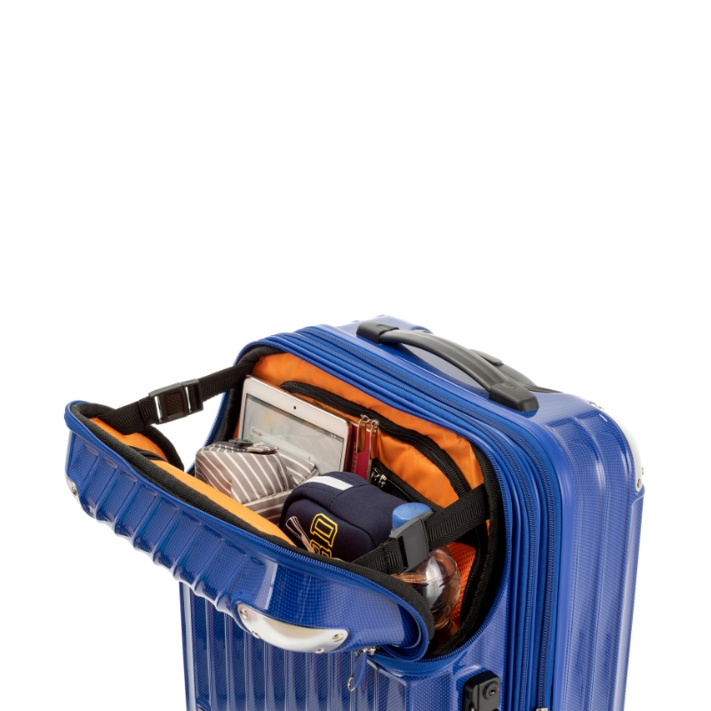 トラベリスト(TRAVELIST)モーメント(MOMENT)。本体を開けずに上部のファスナーを開いて、荷物の出し入れが出来る、トップオープン仕様。本体の素材は、ポリカーボネート+ABS樹脂で軽さと丈夫さを両立させました。さらに拡張ファスナーで容量がUP。旅先で荷物が増えても安心です。ツインキャスターで凸凹な道でも安定した走行をサポートします。内装は、視認性とデザイン性を高めたオレンジ色の生地を使用し、小物の仕分けに便利なファスナーポケット付の仕切りが付いています。Sサイズ35L(拡張時43L)