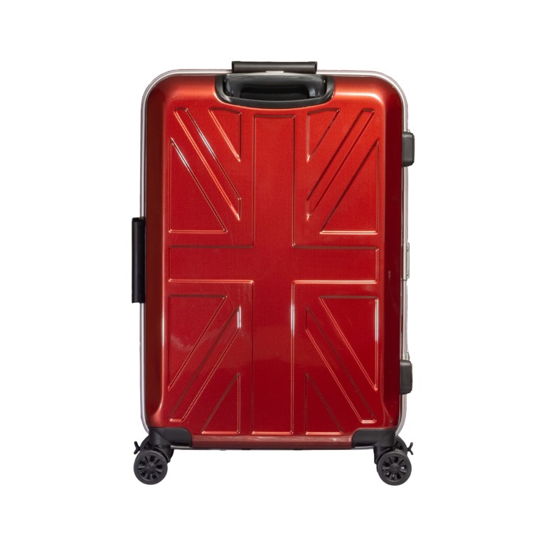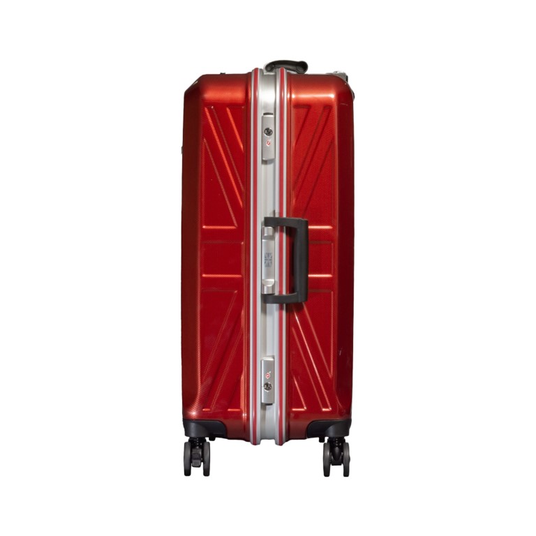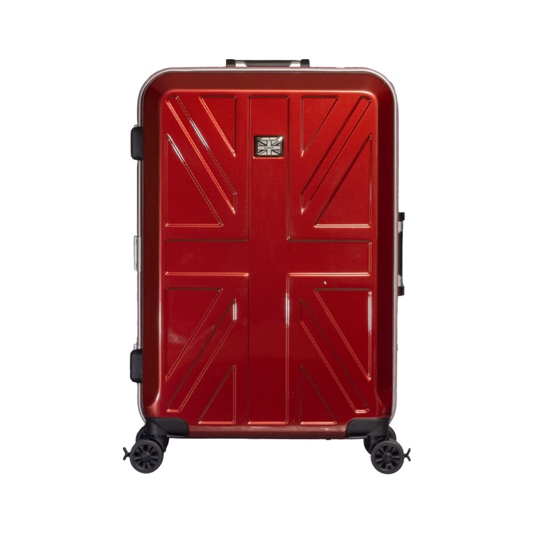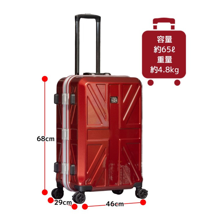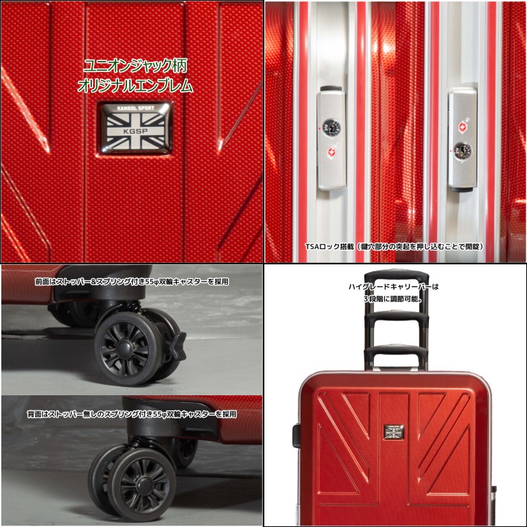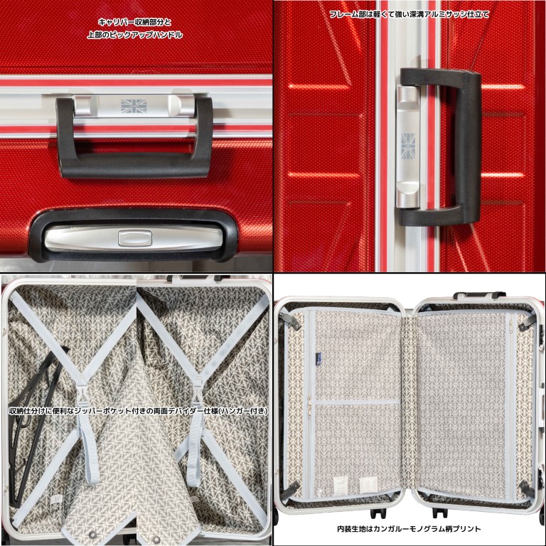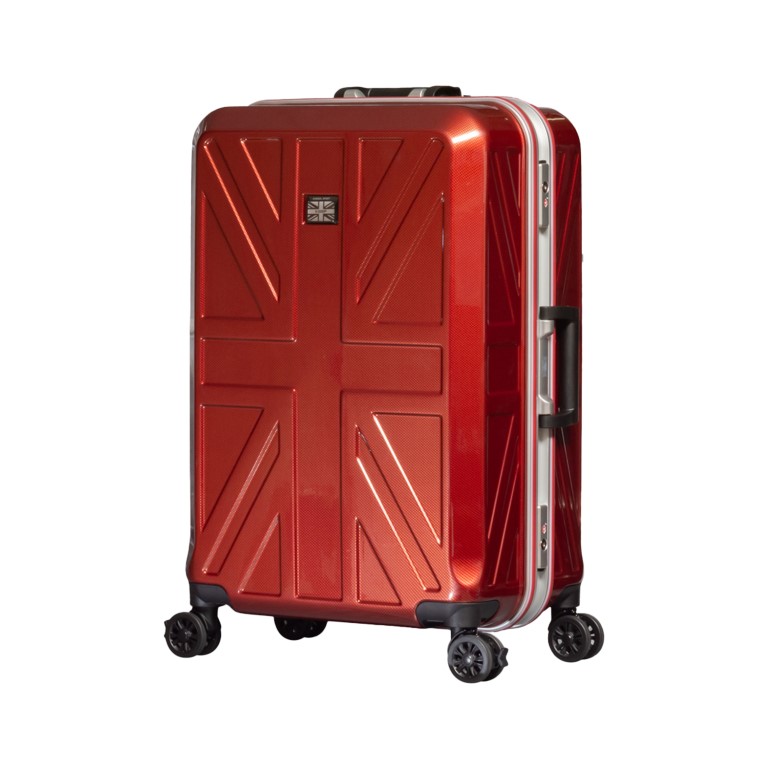 両鏡面ボディの前後左右に英国ユニオンジャックデザインを施したフレームタイプのキャリー。ストッパー&スプリング付き双輪キャスターで安定走行を実現。