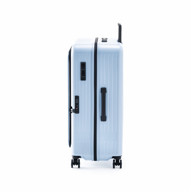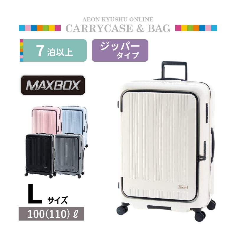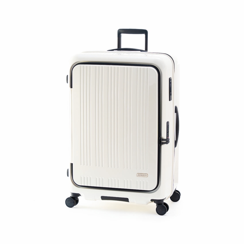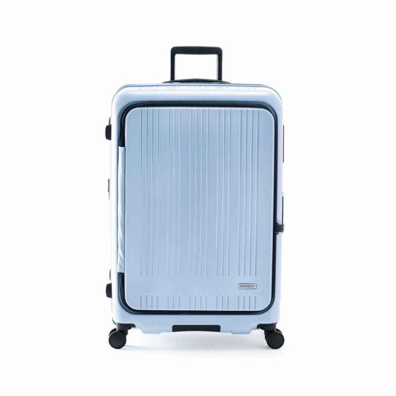 MAXBOX8011フロントオープン。多機能でスタイリッシュ!揺れる電車や坂道で便利なストッパー機能を搭載、そのうえ、前輪だけが止まるので、トローリーハンドルを引いて本体を斜めに倒せばストッパーを解除することなく移動ができます。静音性に優れた新素材採用のLisof® Silent Runを搭載。抜群の安定性と走行性を誇ります。ボディ素材には、新幹線・航空機の窓や防弾ガラスにも採用されている高純度ポリカーボネイトを100%使用しています。内装生地は抗菌防臭加工で快適・安心。優れた耐摩耗性、タフで壊れにくいYKK社製ファスナーを採用。ボトムハンドルは、荷下ろしなどに便利です。