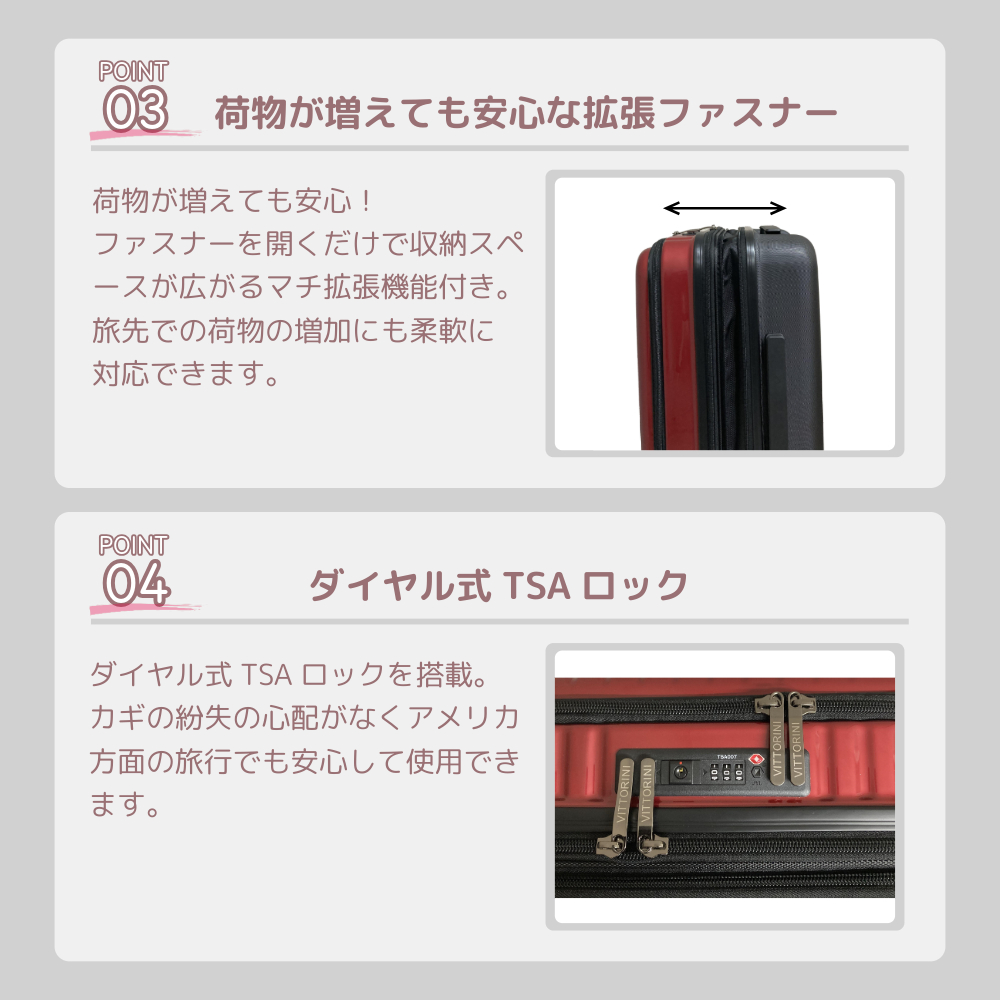 荷物が増えても安心!ファスナーを開くだけで収納スペースが広がるマチ拡張機能付き。旅先での荷物の増加にも柔軟に対応できます。