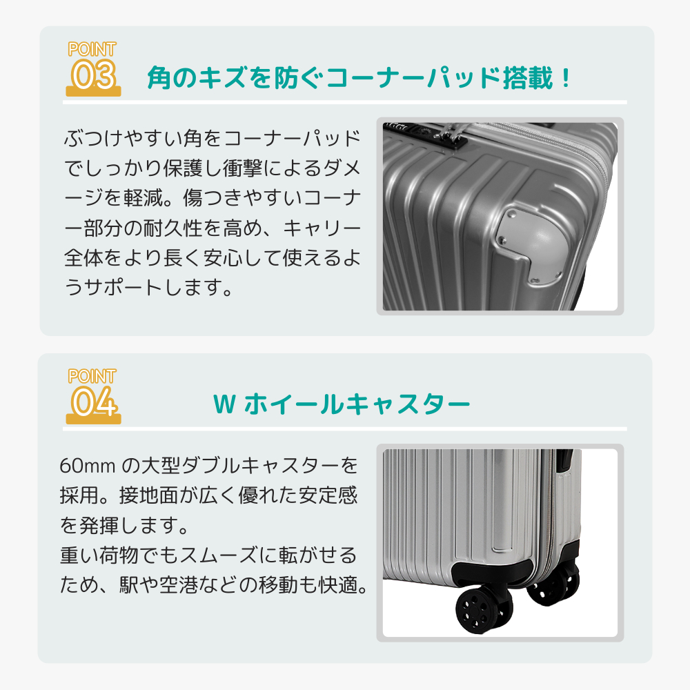 ぶつけやすい角をコーナーパッドでしっかり保護。キャリーケースの耐久性を高めます。