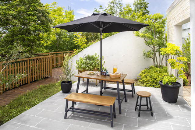 ボタンを押してスライドすることで簡単に開閉ができるパラソル。