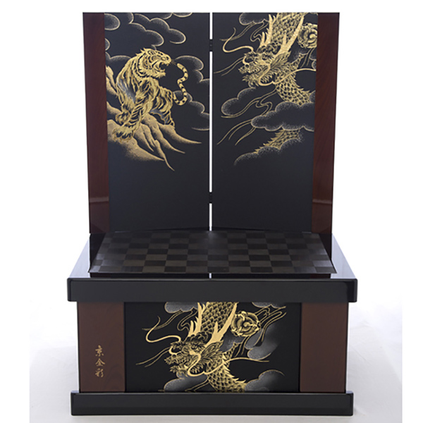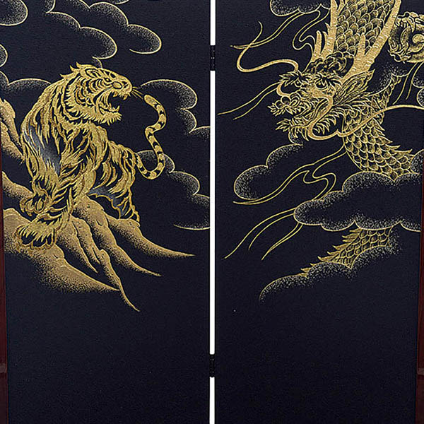 屏風には勇猛な金の龍虎が躍動しています。