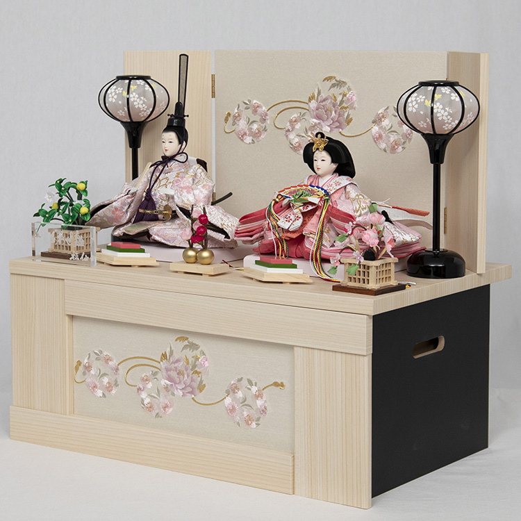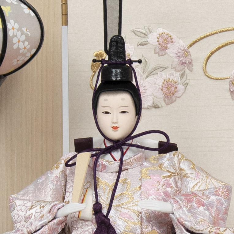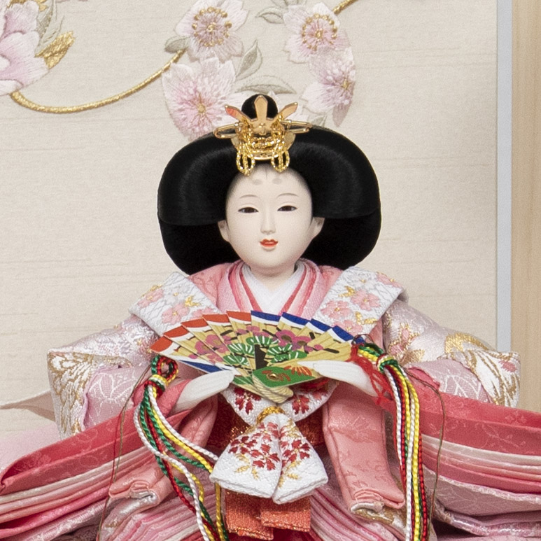 お人形のやさしい色合いと淡い木目の台屏風が調和したお飾りです。