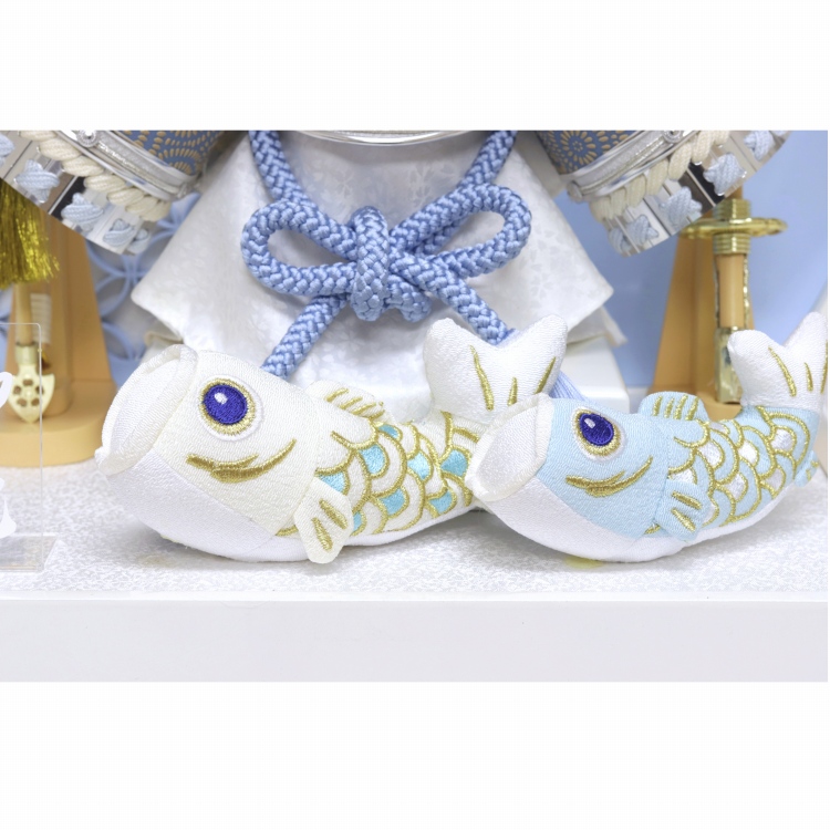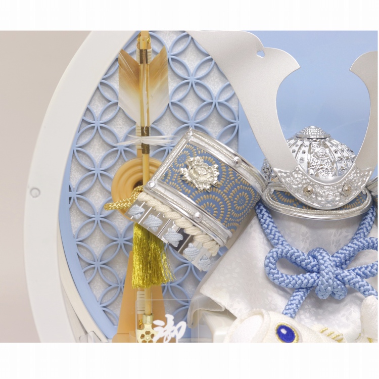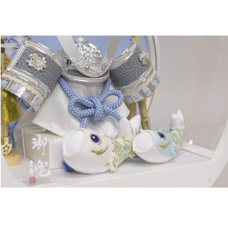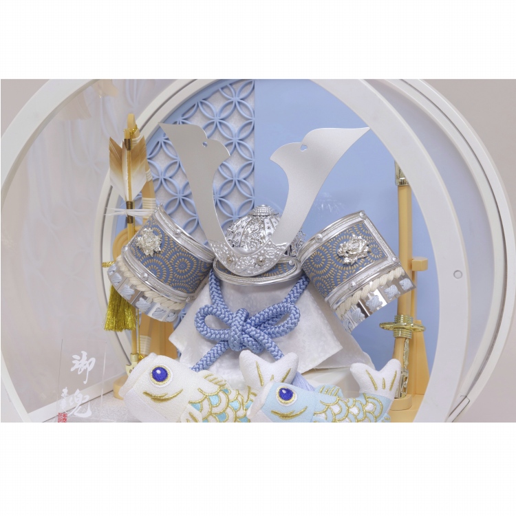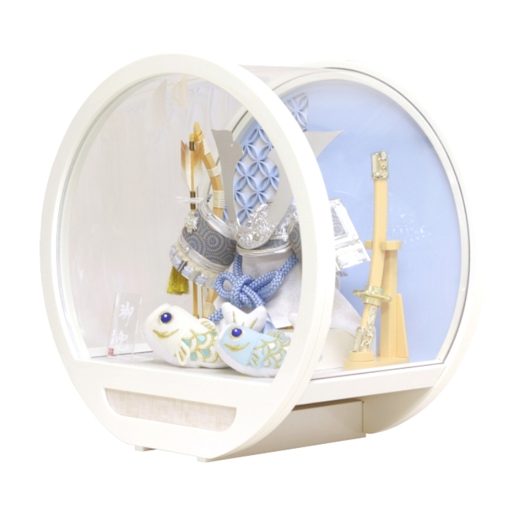 七宝柄背景の白塗円型アクリルケースで、前飾りにちりめん鯉のぼりを配しました。