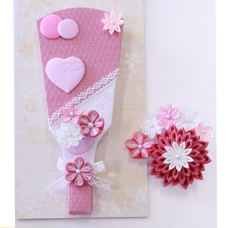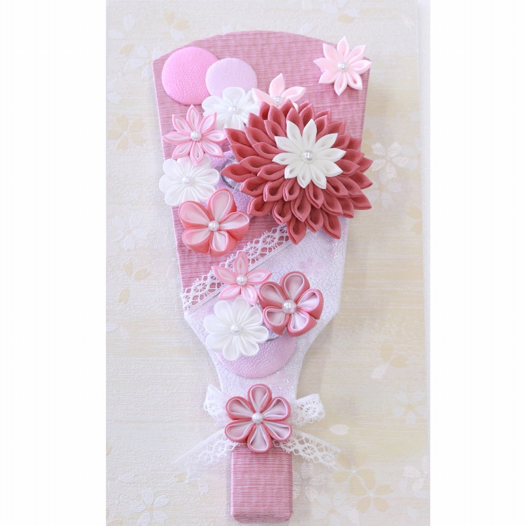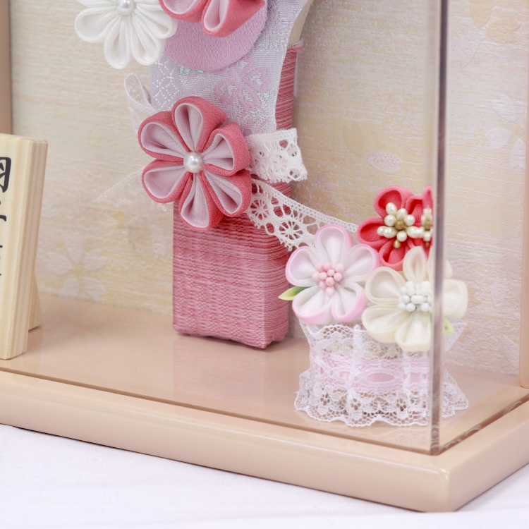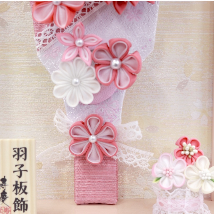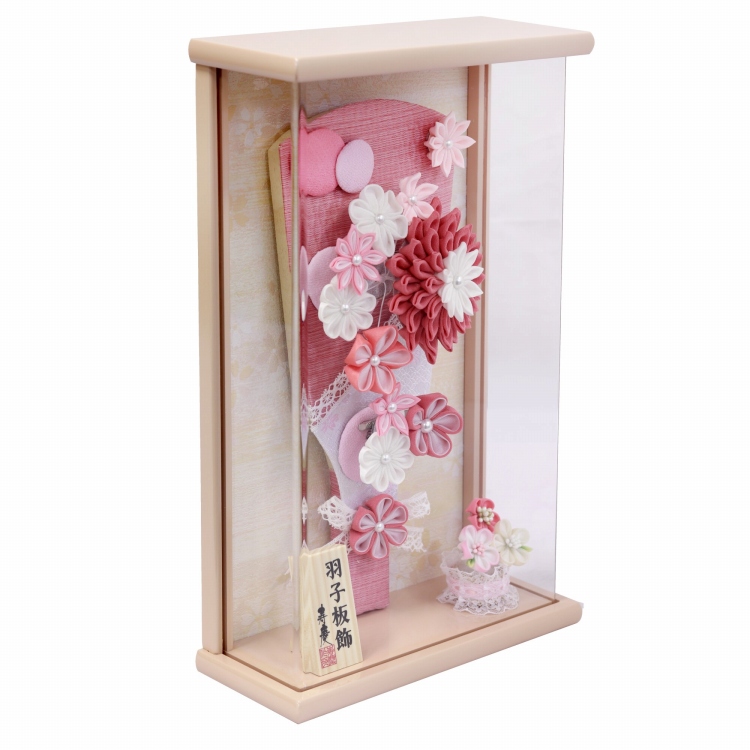 淡くやわらかな雰囲気のアクリルケース入りの、つまみ細工のお花が艶やかな羽子板です。