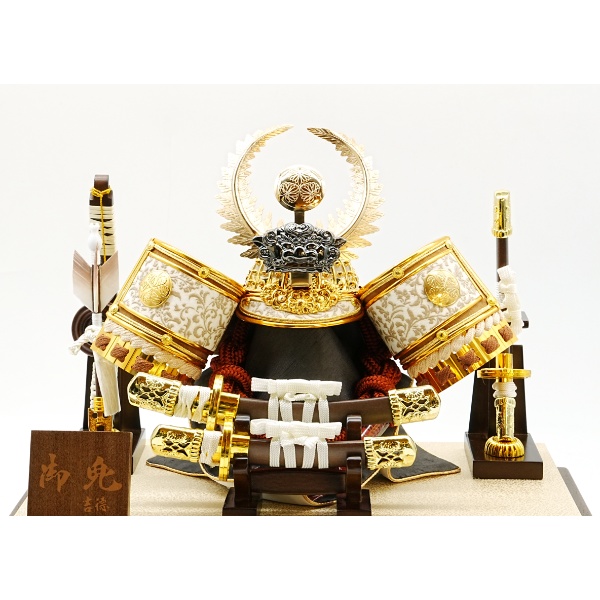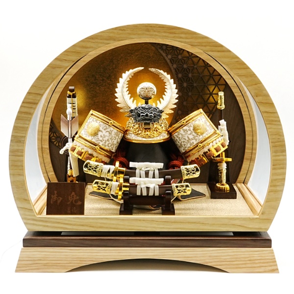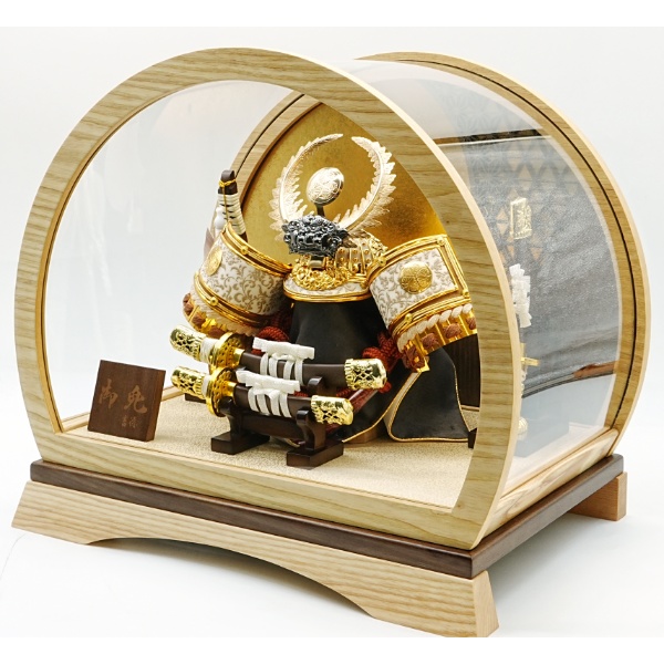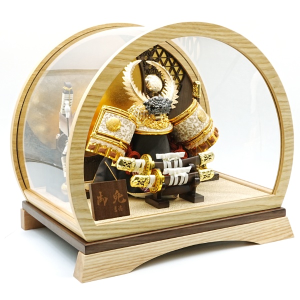 徳川の兜に丸型のケースを合わせた明るく落ち着きのある兜飾りです。