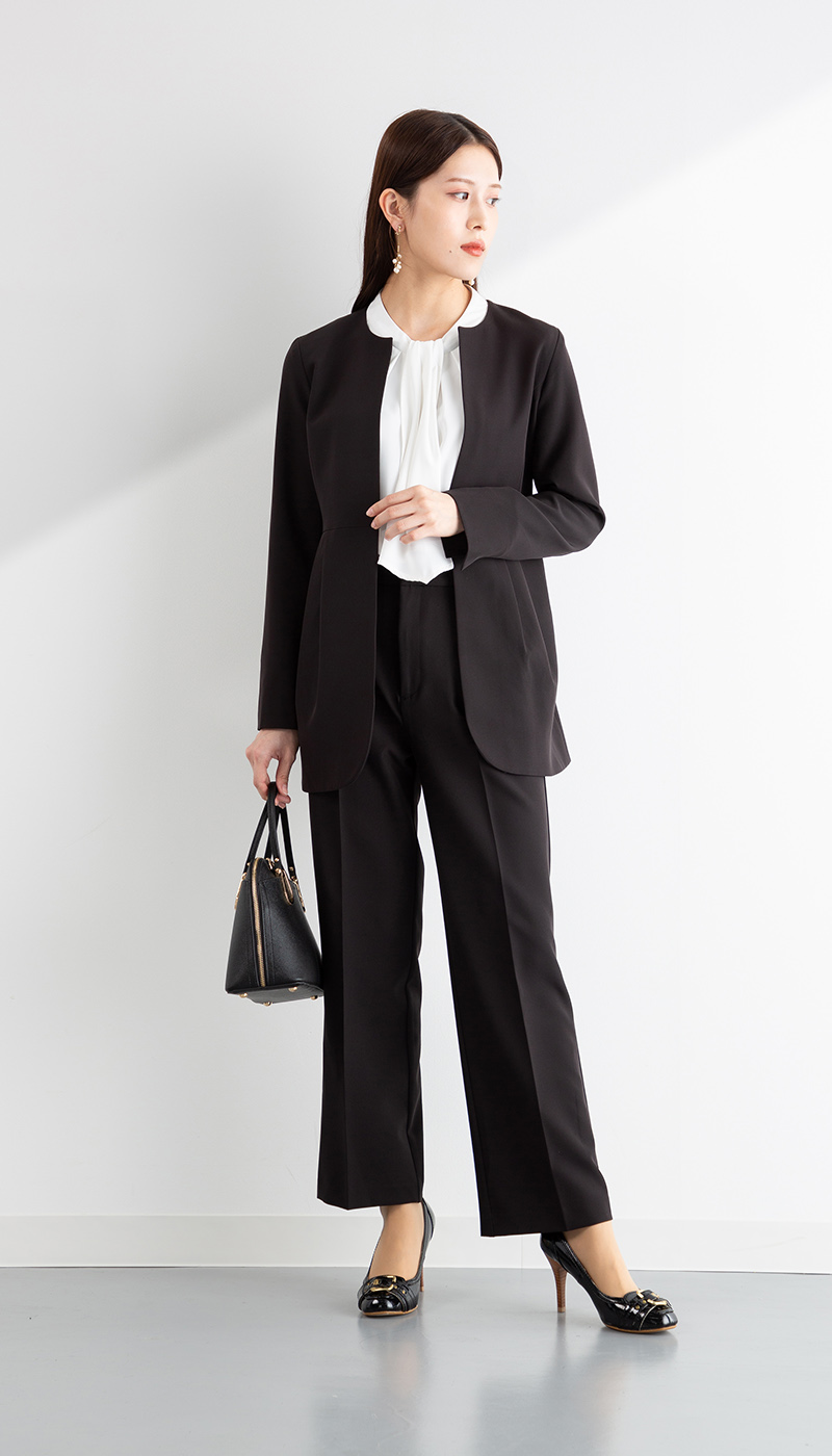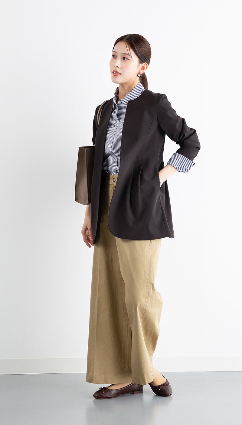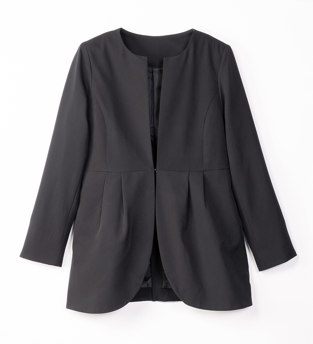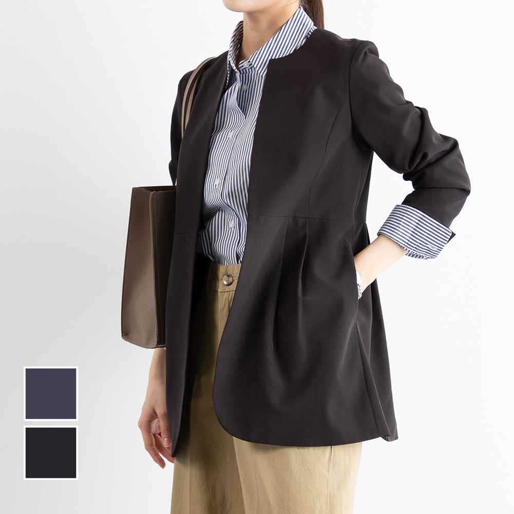 ウエストラインの引き締め効果抜群の裾タックジャケット。どんなブラウスにも合わせやすいノーカラーです。