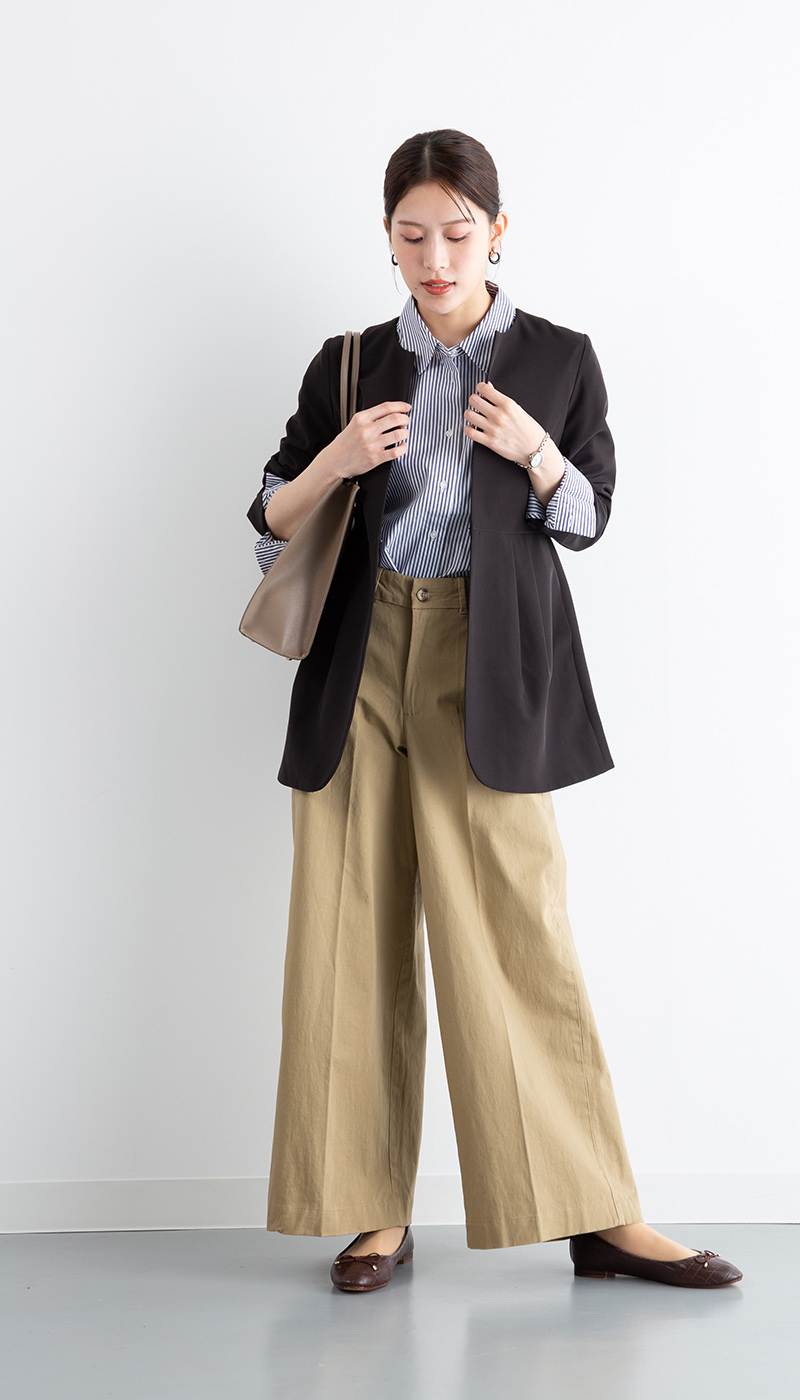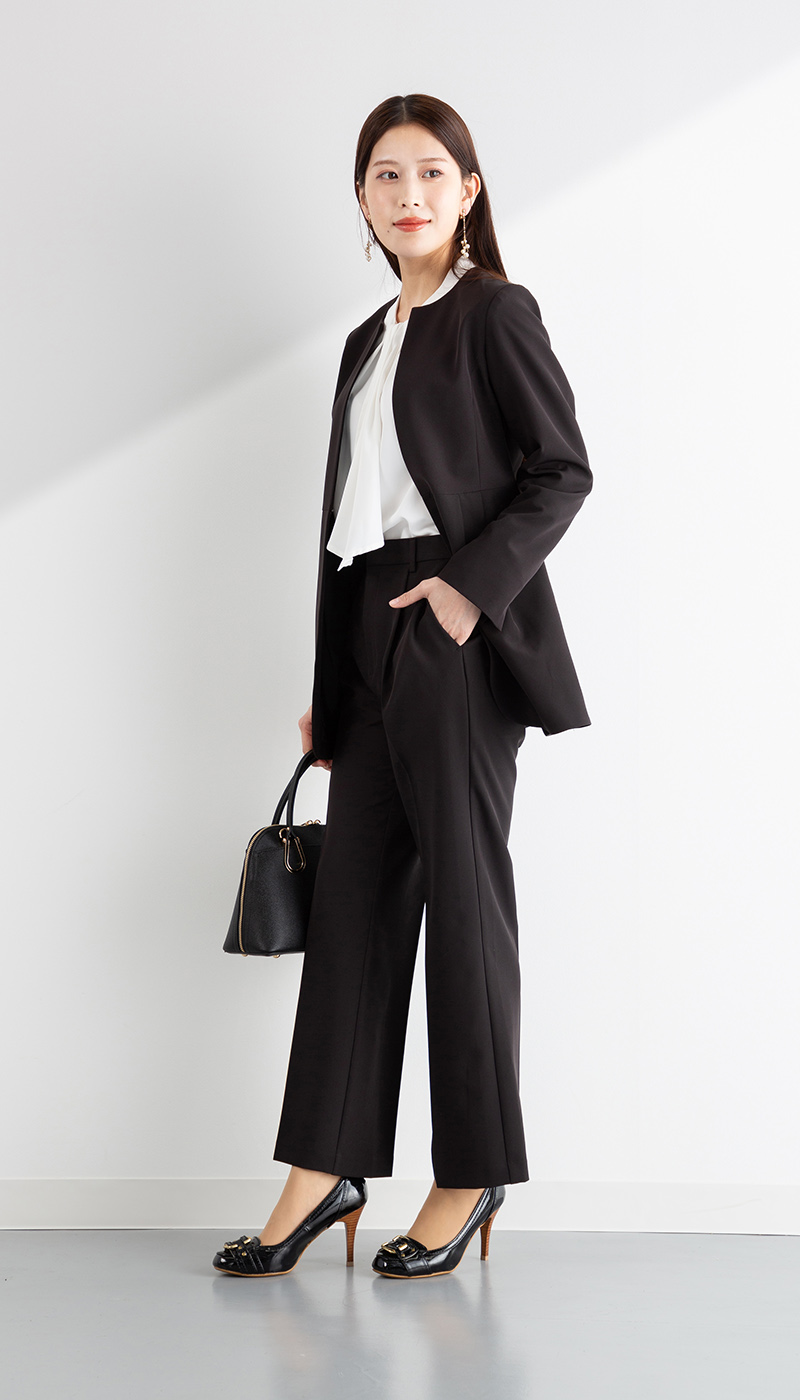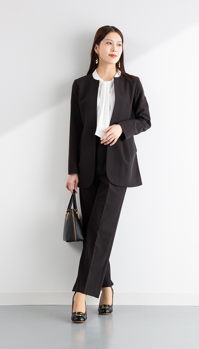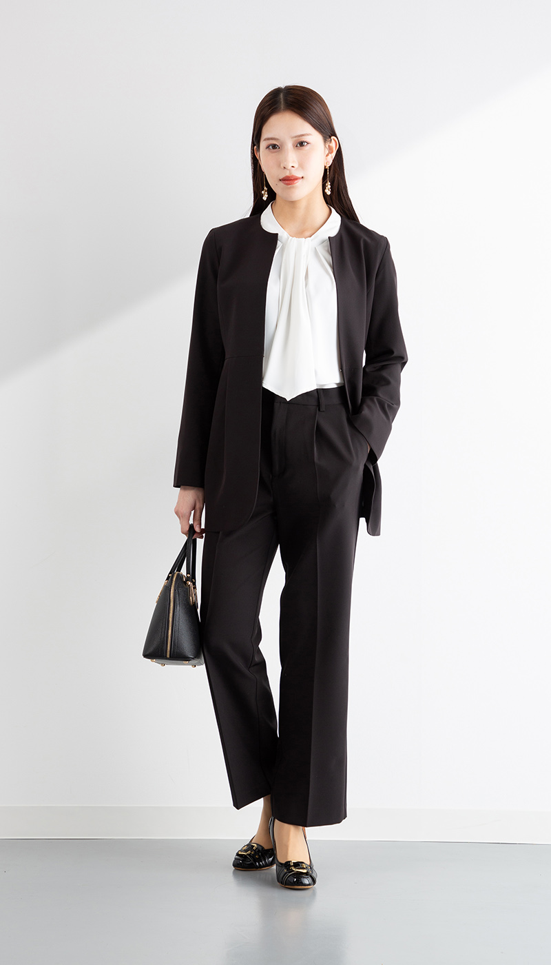 ウエストラインの引き締め効果抜群の裾タックジャケット。どんなブラウスにも合わせやすいノーカラーです。
