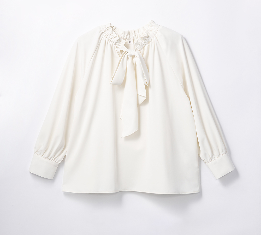 顔まわりがパッと明るく見え、写真映えも◎のボウタイブラウス。