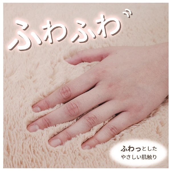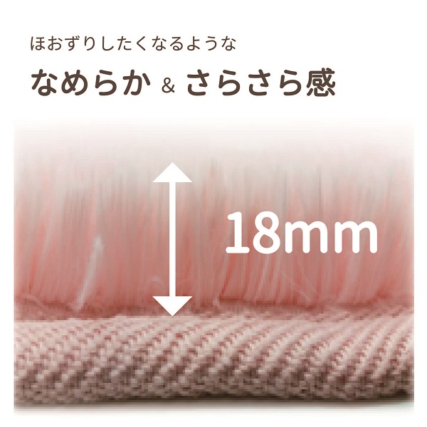 表地にフィラメント糸(極めて長い繊維)を使用しています。遊び毛が出にくく、耐久性に優れています。パイルの長さは約18mmと適度な長さで、しっとりふわふわとしたやさしいタッチ感を出しました。