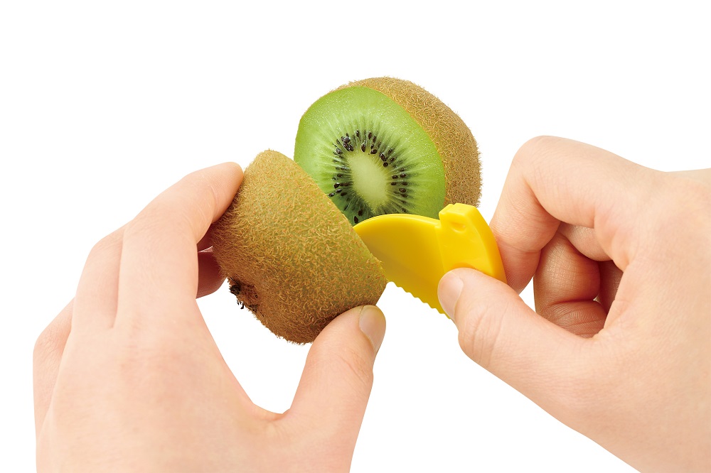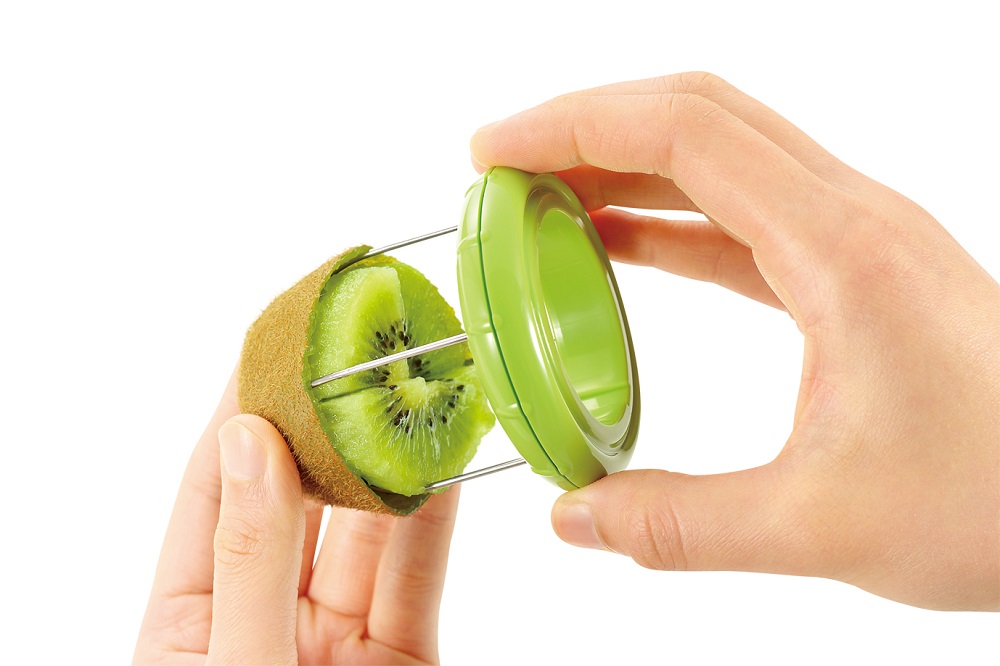包丁いらずでキウイをカットできます。付属の樹脂製ナイフで2つにカットし、金属部分を押しこんだらそのまま回転させてカットするだけ。false