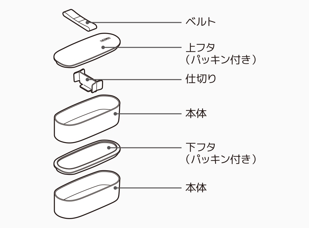 奥行き6.5cm。スリムなカバンにもすっきり収納 食洗機対応!全てのパーツが食洗機に対応しているのでお手入れが簡単 内側に角がなく洗いやすい!日々のお手入れを考慮した、洗いやすい形状 2段重ねた状態で固定したり、不注意でフタが開いてしまうことを防ぐためのベルトが付属 サーモスの保冷バッグやソフトクーラーがあれば、お弁当がいたみやすい季節も安心してご使用いただけます |