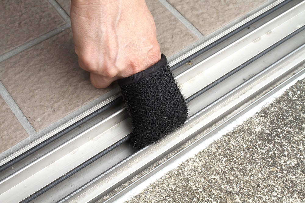 サッシの溝にフィット!指にはめる形状で汚れをかき取る!収納に便利な吊ヒモ付き