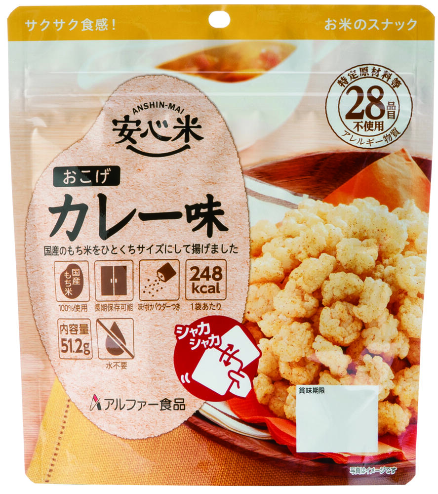 消費期限は製造より5年。国産のもち米ひとくちサイズにして揚げたカレー味の米加工品です。
