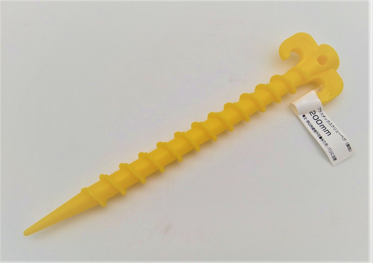 【特長】プラスチックなので軽くて持ち運びに便利。・スクリュー形状により柔らかい地面にもしっかり固定できる。テント張りやアウトドアにて便利