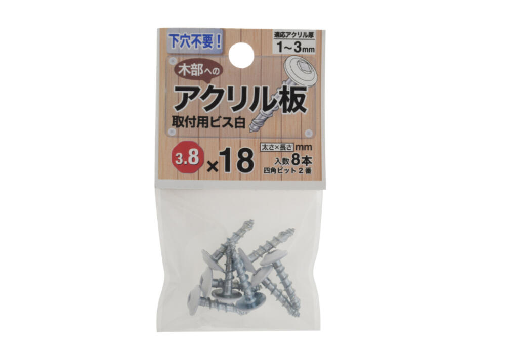材質は鉄でユニクロめっき。先端特殊形状の為、アクリル板へ下穴をあけなくても直接アクリル板を木に止める事ができます。通常のねじに比べアクリル板の割れが防げます。
