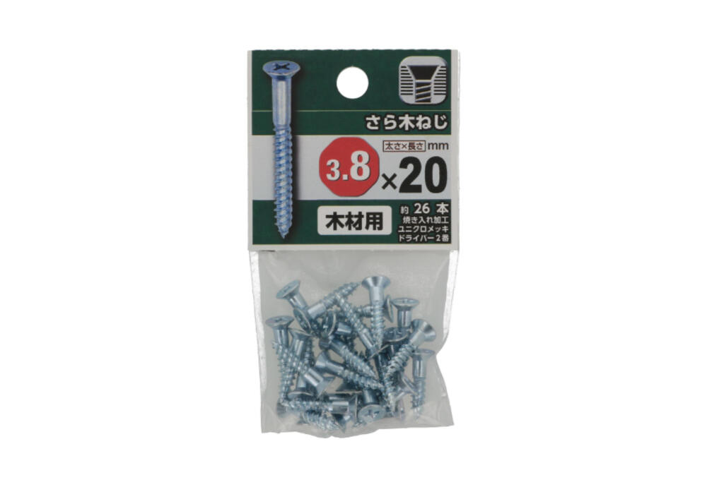 材質は鉄でユニクロめっき。十字穴付きの皿頭ねじで、木材専用です。