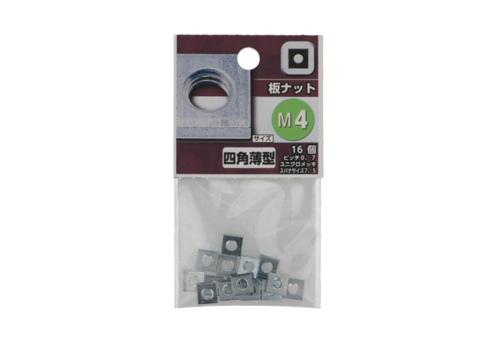 薄板よりプレス加工した4角ナットです。主に小ねじと組合せて使用されます。あまり強度を必要としない場所に適しています。