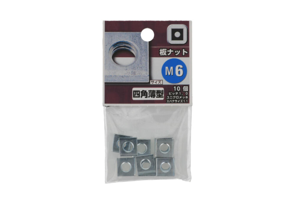薄板よりプレス加工した4角ナットです。主に小ねじと組合せて使用されます。あまり強度を必要としない場所に適しています。