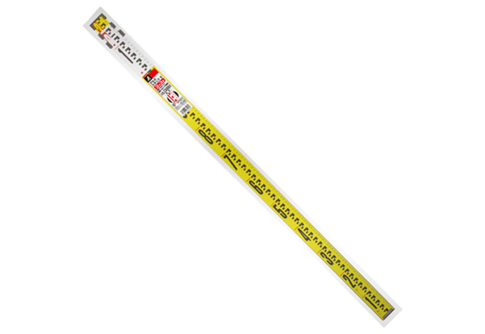 表面は10mm毎に黒と50mm毎に赤の読み取りやすい目盛線が入っています。●表面は長さが一目でわかる様に1m毎に黄・白の順に地色が交互になっています。●裏面は基準からの通し目盛を1mmピッチにしたもので、外構工事などに便利です。