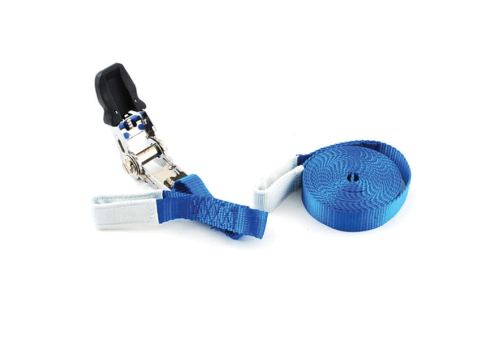 ベルト幅:25mm。●全長:5m(固定側0.5m/調整側4.5m)。●最大使用力:1.5kN(152kg)、破断荷重:6kN(611kg)。●バックルの種類:ラチェットバックル。●端末の仕様:両端アイ。