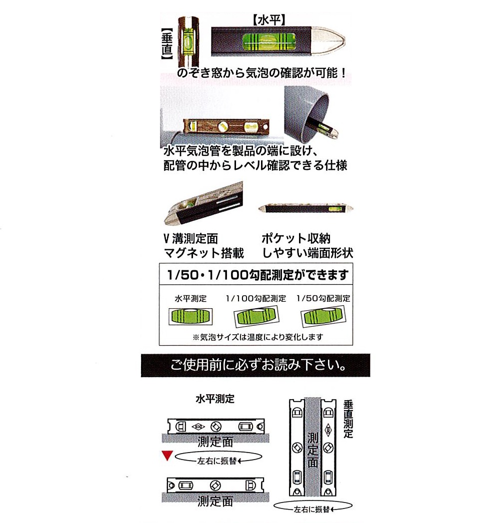 ●感度0.5mm/m=0.0286° ●精度±1.5mm/m=±0.0859°以内 |