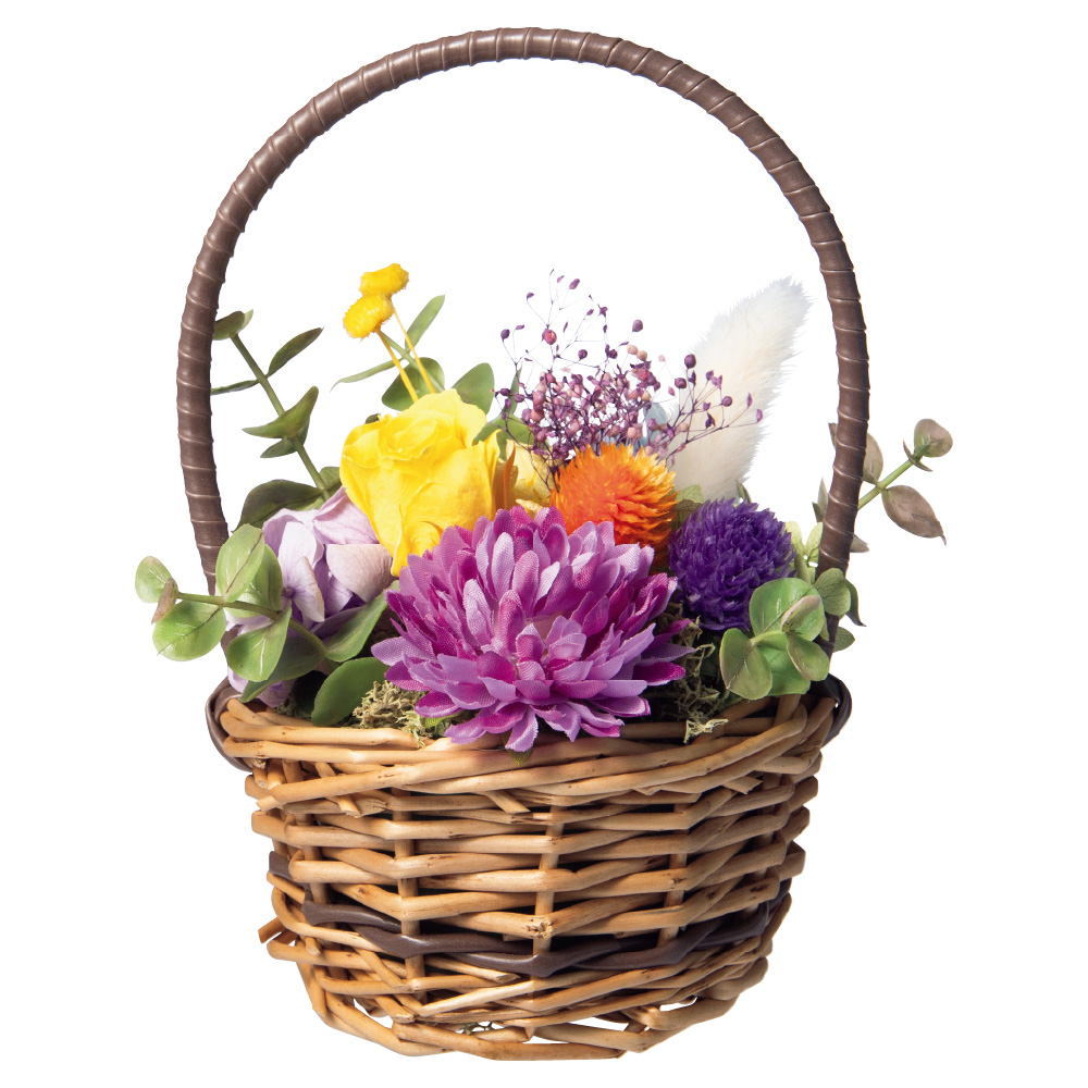プティガトーアソルティ(フィナンシェ・マドレーヌ・キャラメル・抹茶 各2、ピスターシュ、フランボワーズ、ミルクチョコ、フレーズ)、プリザーブドフラワー((バラ、千日紅、アジサイ、カスミソウ)、ドライフラワー、造花、バスケット:幅約11×高さ約17cm)