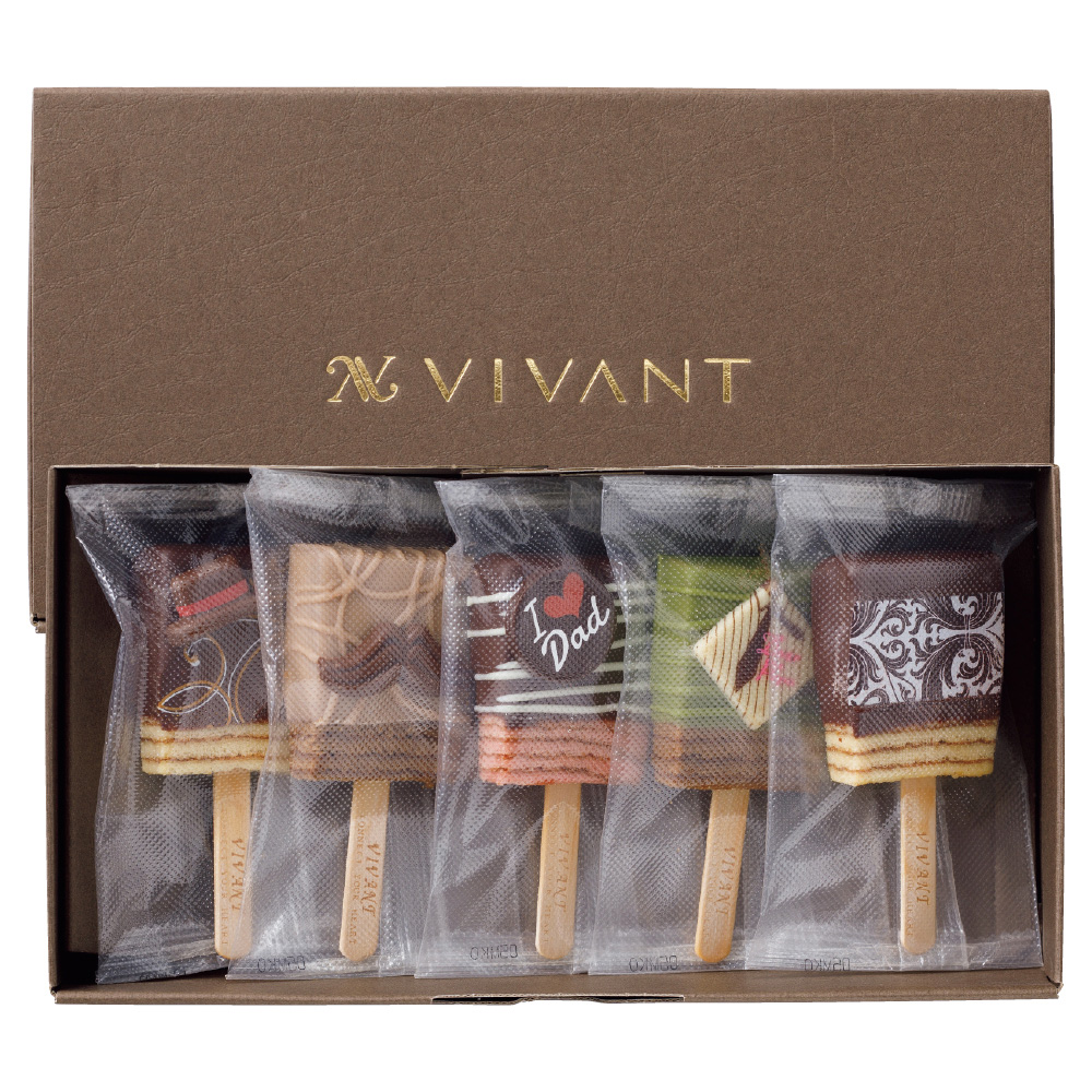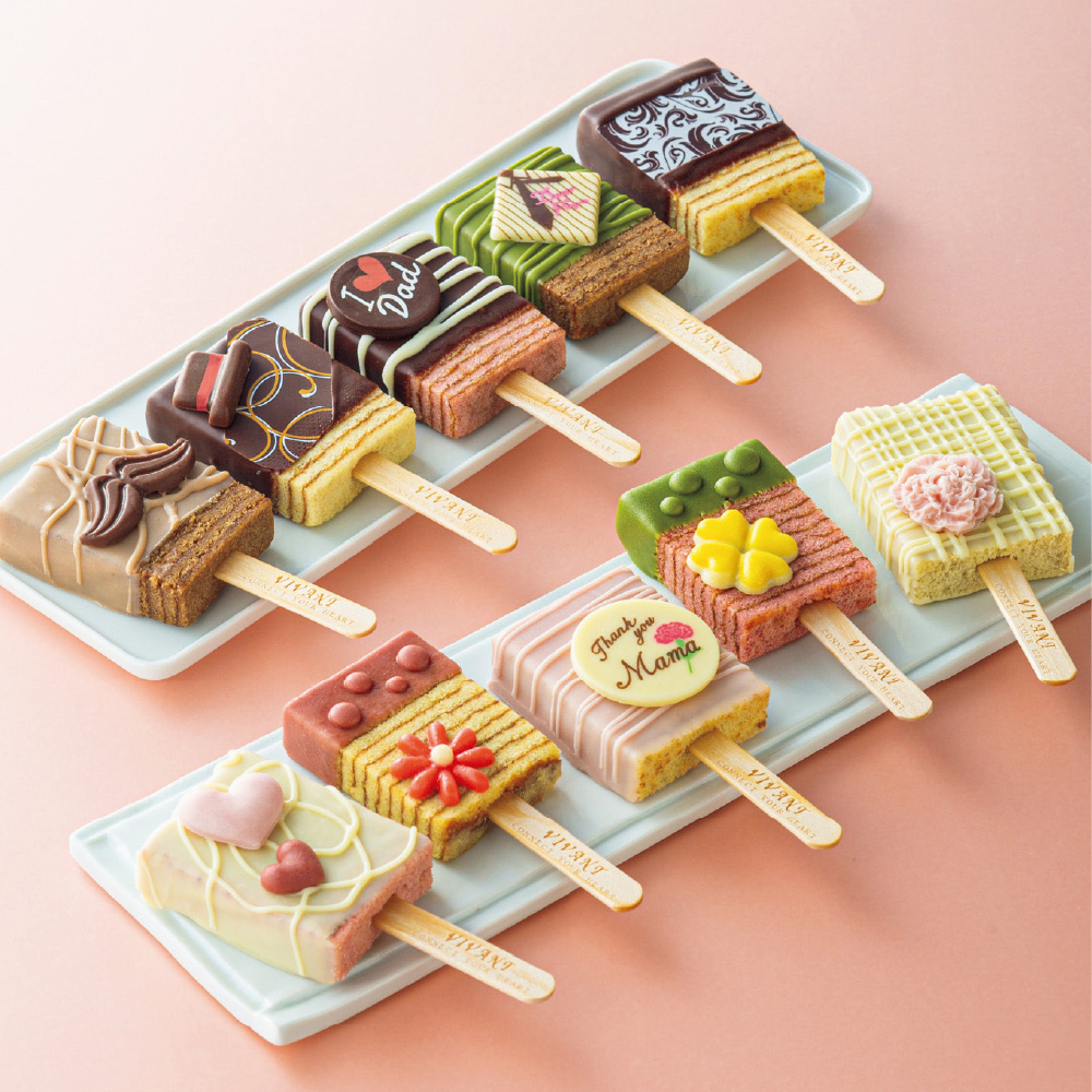 米粉を使って焼き上げたバウムクーヘンをチョコでコーティング。カラフルなキャンディ型に仕立てました。