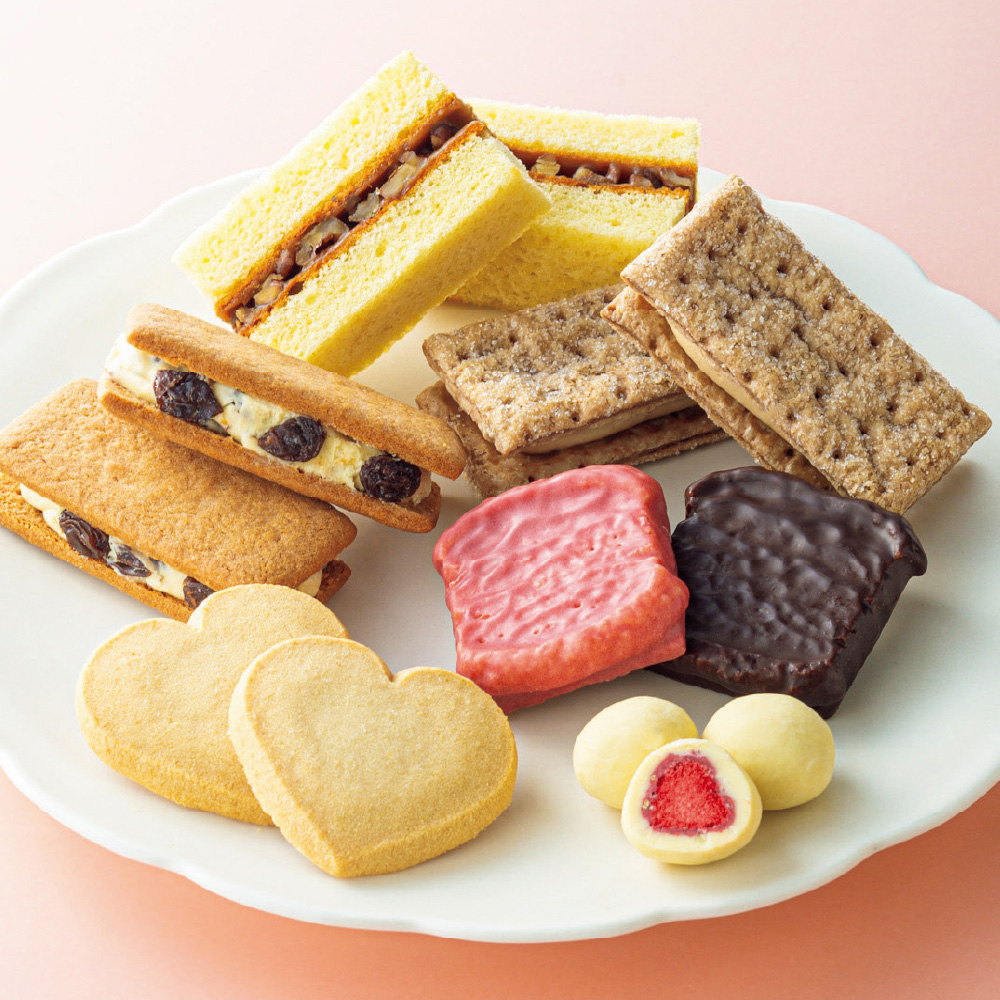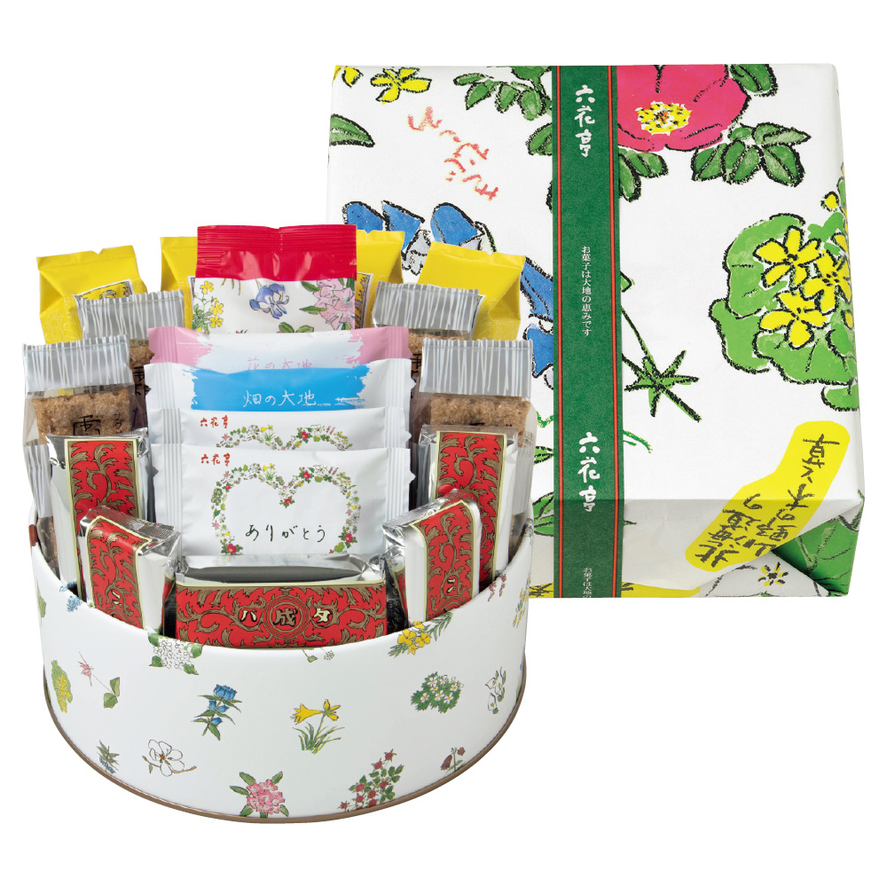 「マルセイバターサンド」をはじめとする人気の焼菓子各種とチョコレートを、かわいい花柄の缶に詰合せました。