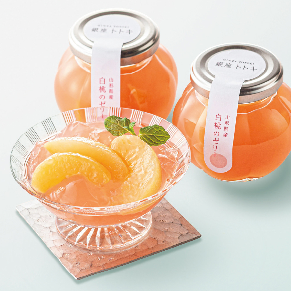 山形県産白桃の果実と白桃ピューレを使ったゼリー。果肉の食感と豊かな香りをご堪能ください。