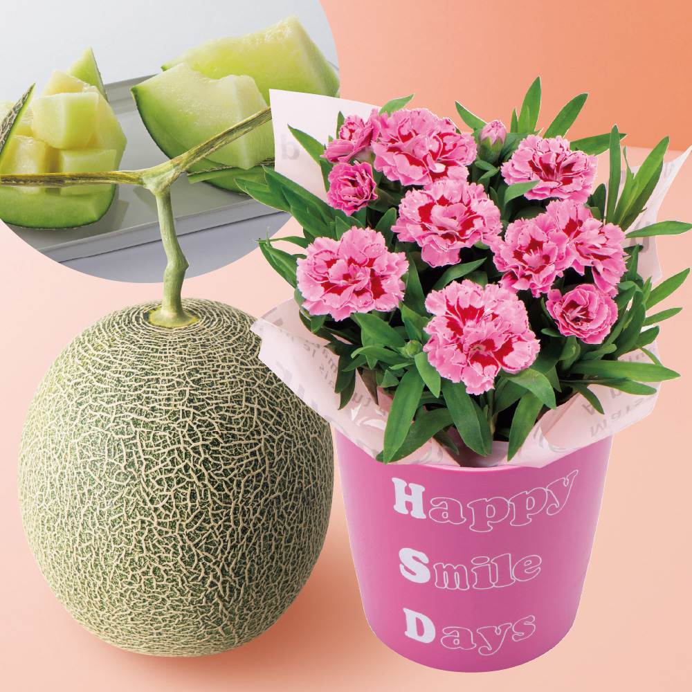 カーネーション(3.5号、高さ約18×鉢直径約12cm)、陶器鉢、メロン1個(2Lサイズ、1.6kg)