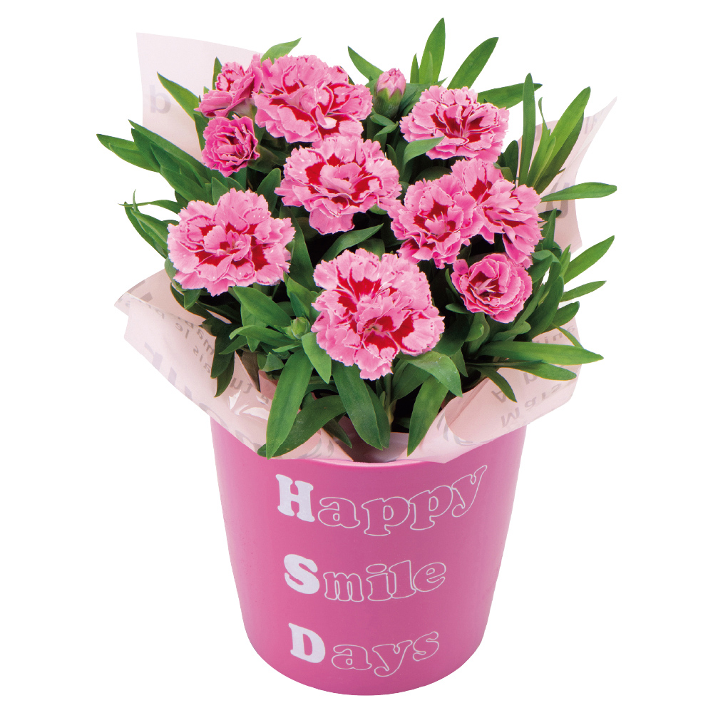 中心に模様が入るフリンジ咲きのカーネーションと、熊本県産「肥後グリーン」をセットにした、母の日にぴったりの贈り物です。